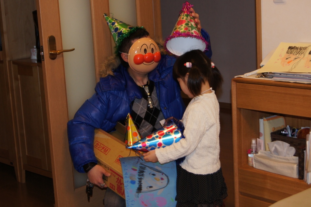アンパンマンに帽子をかぶせてもらって、さくちゃんは大喜び