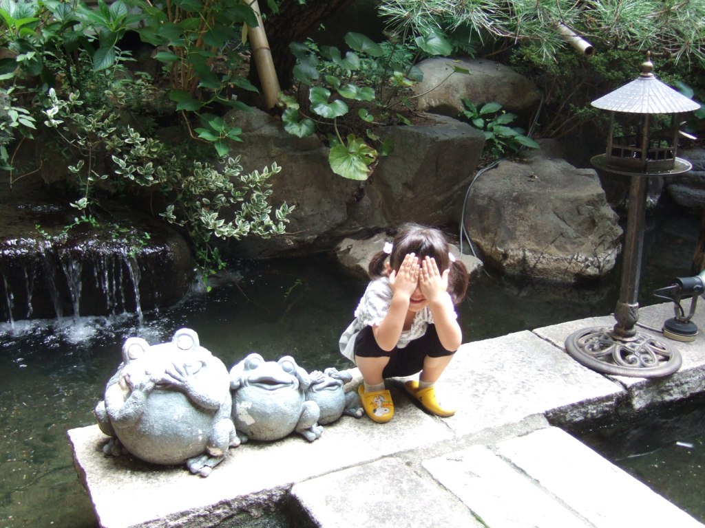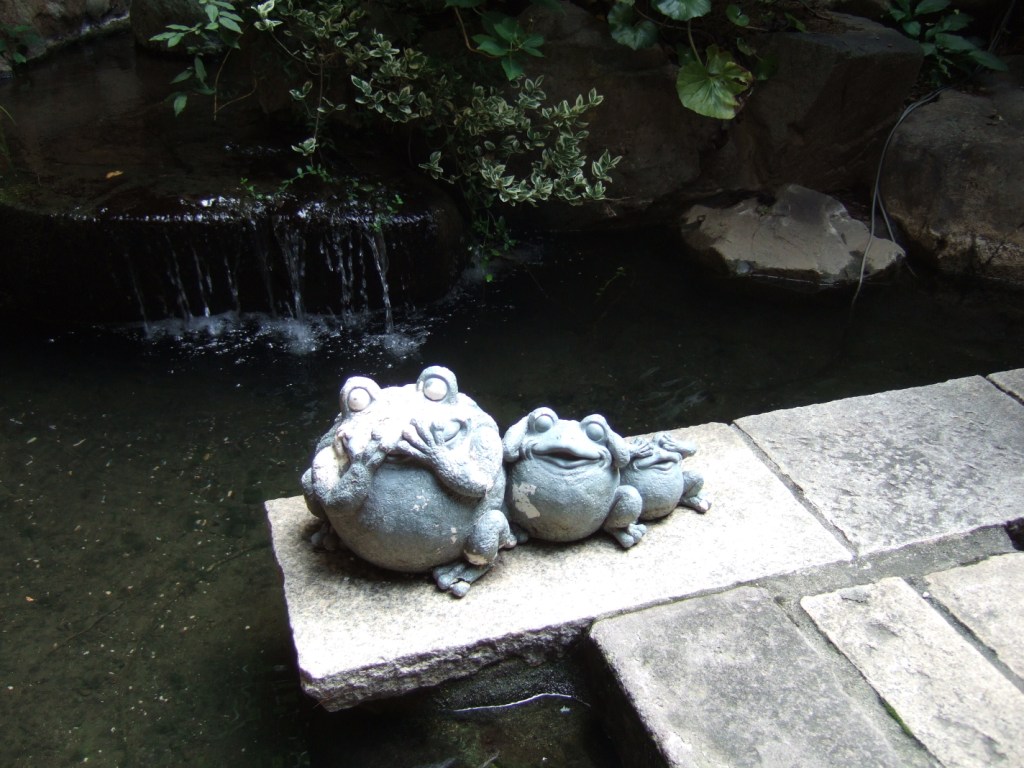 旅館の中庭に、あの日光の『見猿・言わ猿・聞か猿』のカエルバージョン