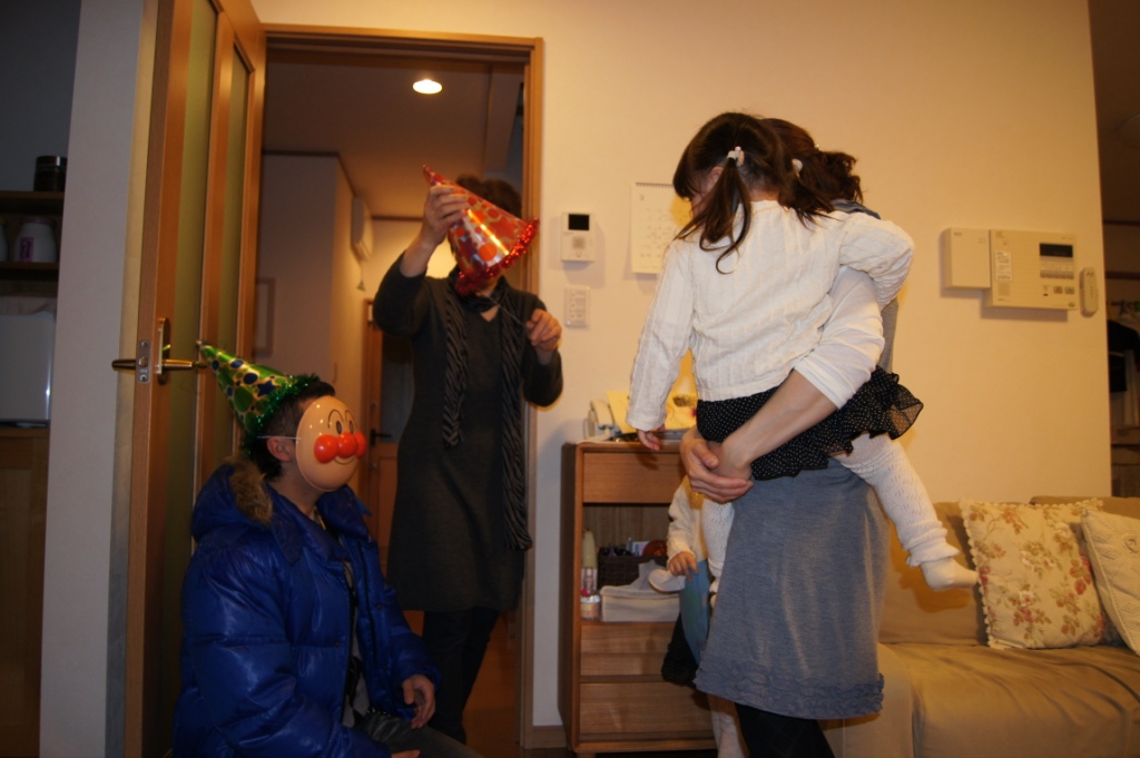 ママにしがみついています(笑)みーちゃんはアンパンマン大好きなのになぁ
