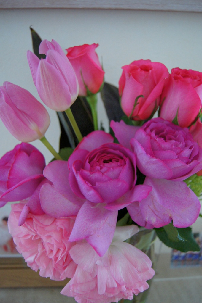 ピンクのかわいいチュ-リップと イブピアジエ、ビバーナムのバラの花束です