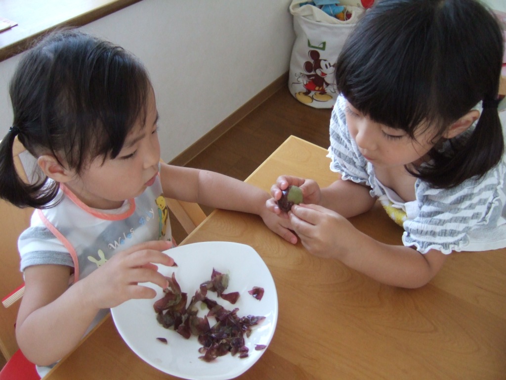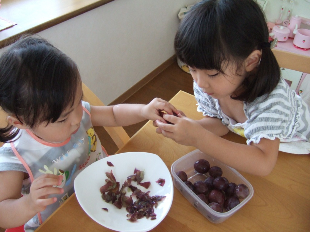 みーちゃんに皮をむいてあげるさくちゃん